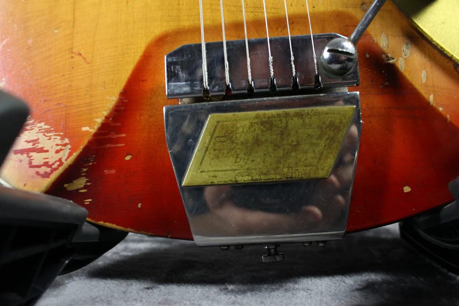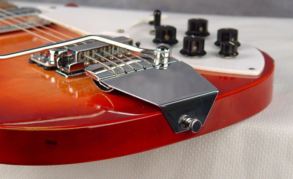 So you can see from above Butts filed the patent in September of 1960, but he’d already begun shopping the design around. Looking to replace the woefully outdated Kauffman, Rickenbacker jumped on the simple but relatively effective design and it began appearing on vibrato-equipped Capris in mid 1960.
