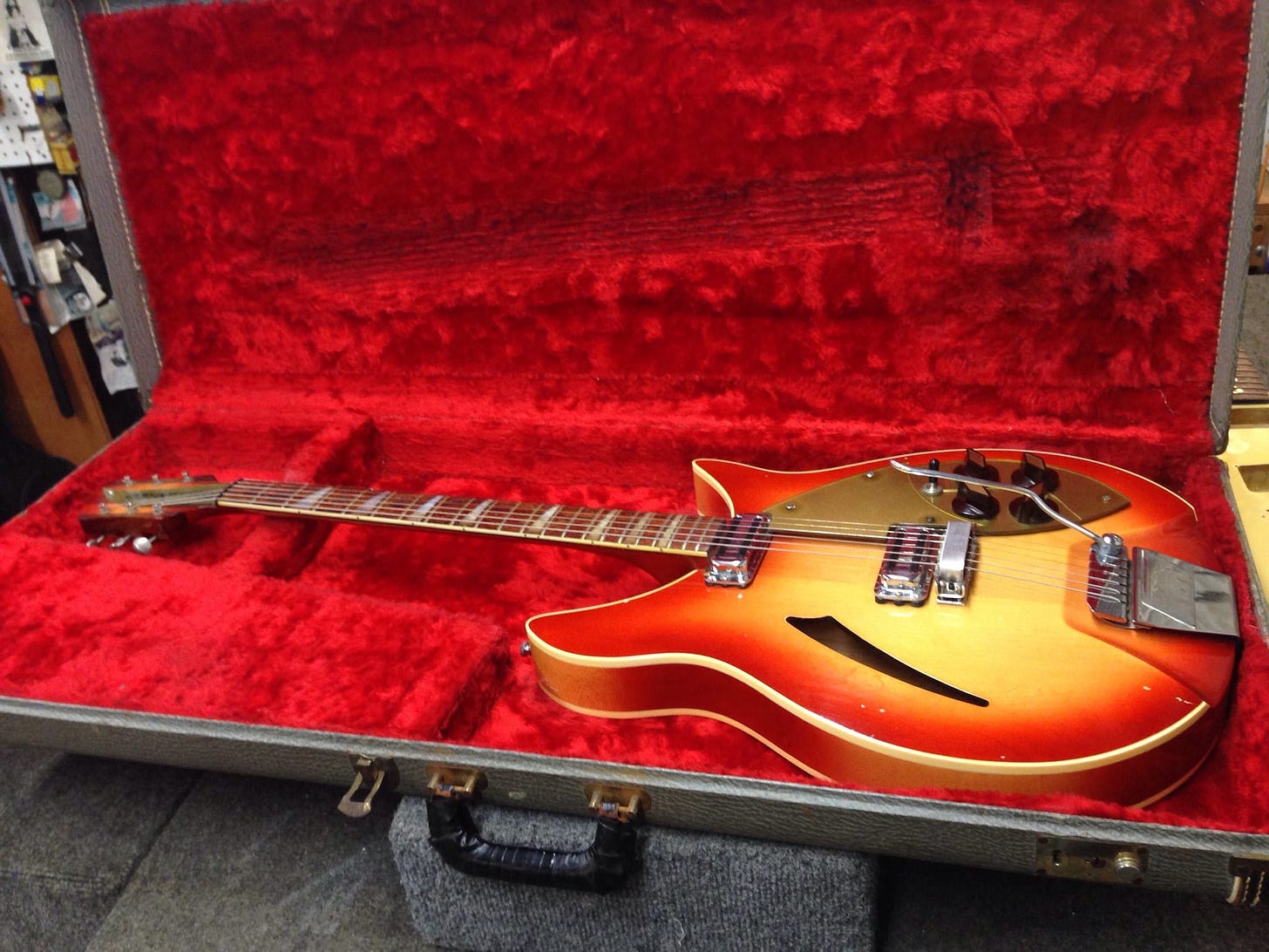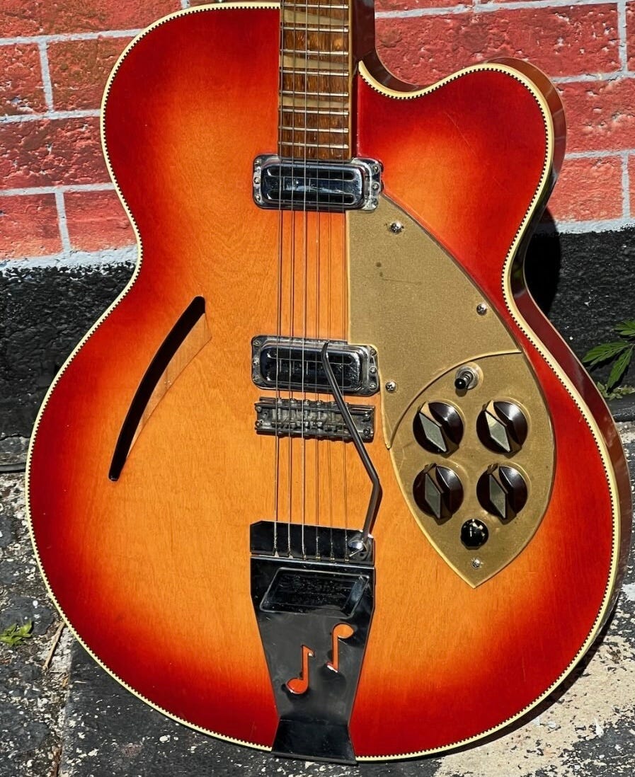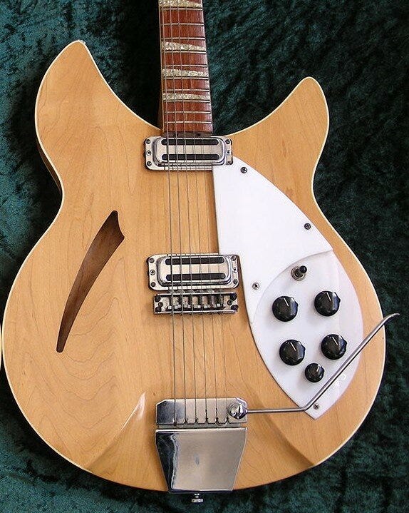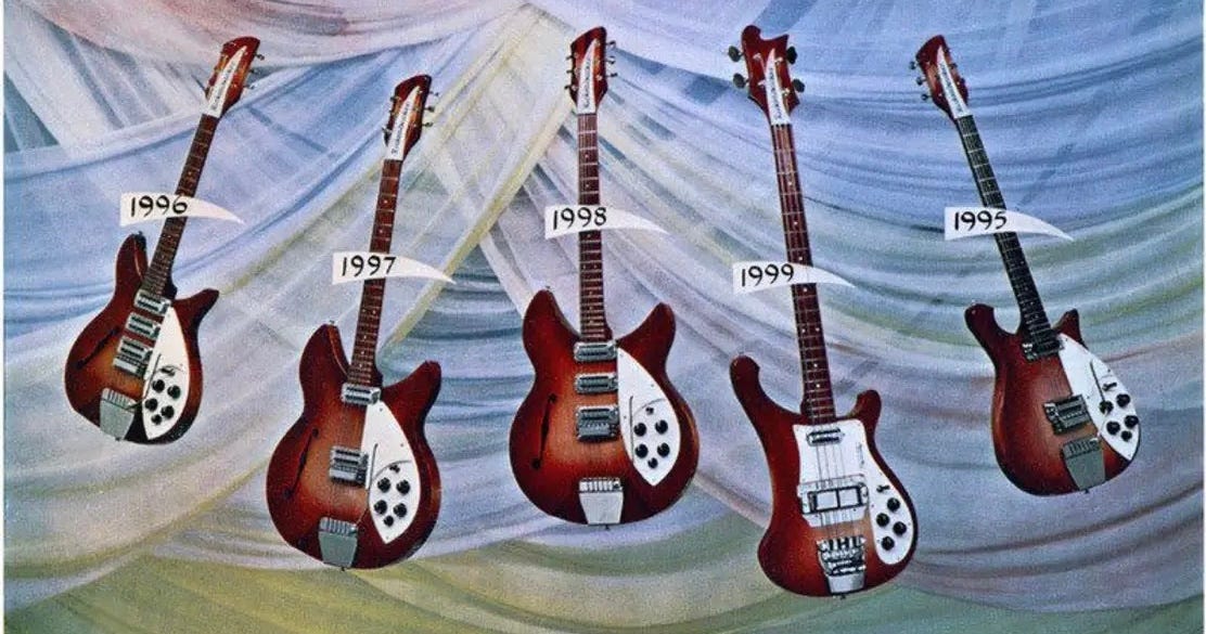 The Accent (minus its apostrophe/accent) was back. And has been ever since, appearing on multiple reissue models of classic 1960s guitars like Lennon’s above and the Rose Morris models. In the mid 1990s to early 2000s it could even be added to (almost) any 6-string model by clicking the “Vintage reissue vibrato (VB)” box on the custom order form. Today it is only available on the 325C64 or from the Boutique (and not always there).