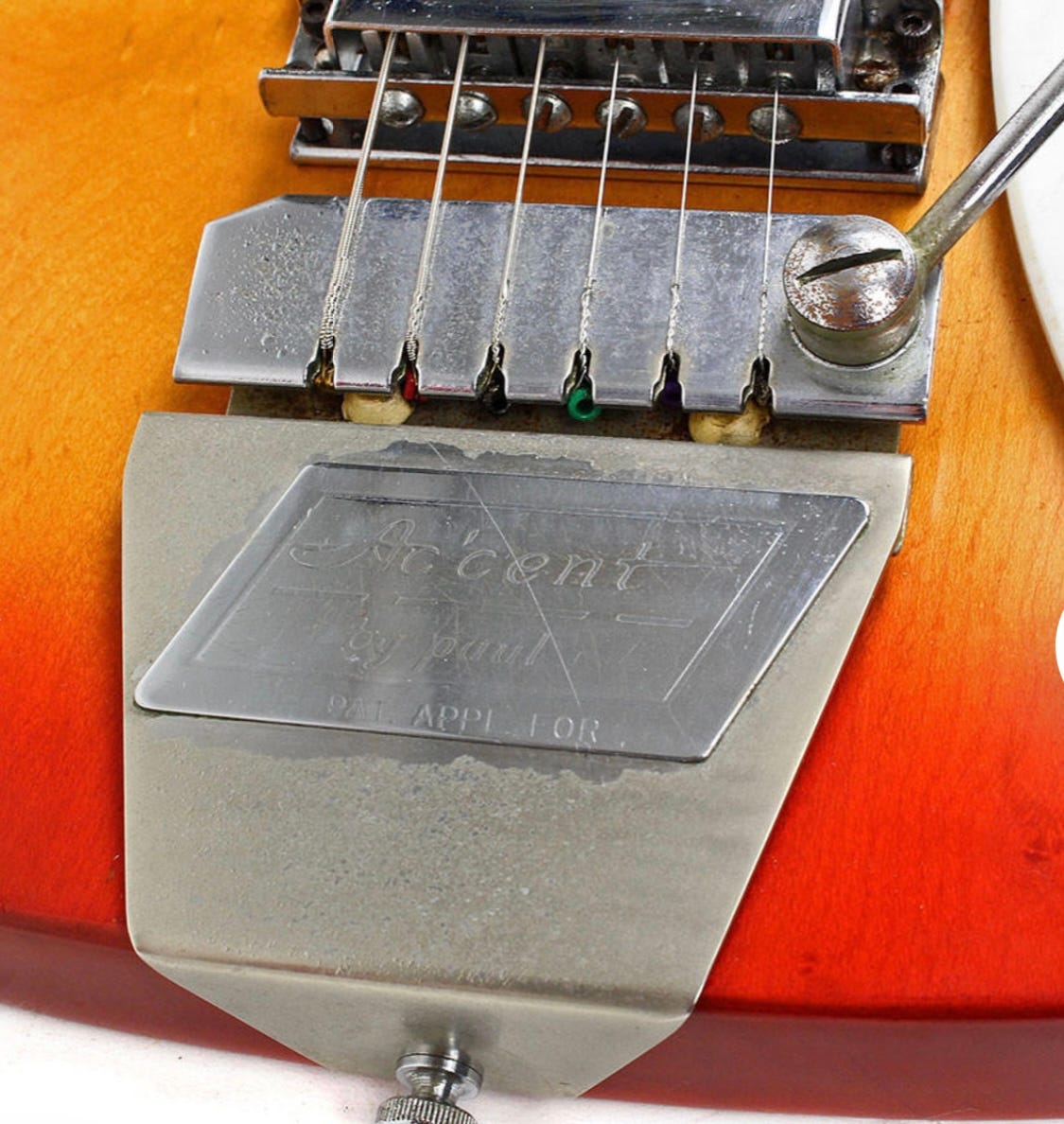 As already noted, from launch to mid 1963 the tailpiece had a plaque affixed that read “Ac’cent by paul” and “PAT APPL. FOR”. The chrome plating over the brass plaque can be prone to wearing.