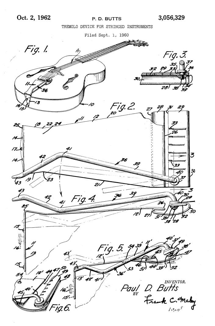 Let’s get this out of the way: yes, the Accent Vibrato appeared before the Gibson Maestro Vibrola and yes, they are mechanically identical. But no, Gibson did not plagarize the Accent. And that’s because Rickenbacker didn’t invent it either. Both companies licensed the design from the actual inventor, Paul D. Butts.