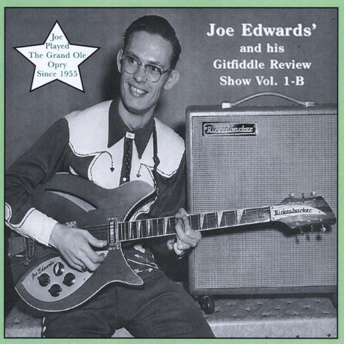 First: Joe Edwards. Later in life, Edwards would go on to play fiddle and guitar in the Grand Ole Opry house band from 1968 to 1999, but at the time he received his 1958 365 Capri from Rickenbacker, he was a Rickenbacker endorsee and mostly known as a sideman for a number of minor Nashville stars like Martha Carson and Wilma Lee.