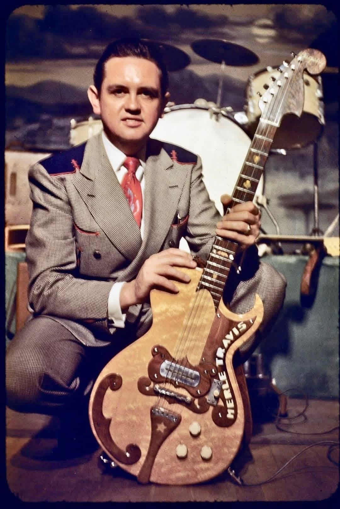Now Paul Bigsby made lots of custom guitars for people with their names on them—and they were truly custom-built instruments. But it wasn’t just Bigsby. Here’s Travis with a custom-built 1952 Gibson Super 400.