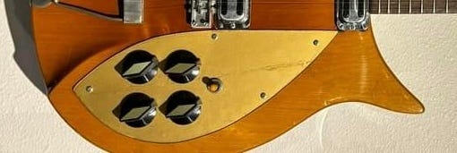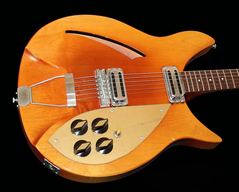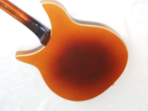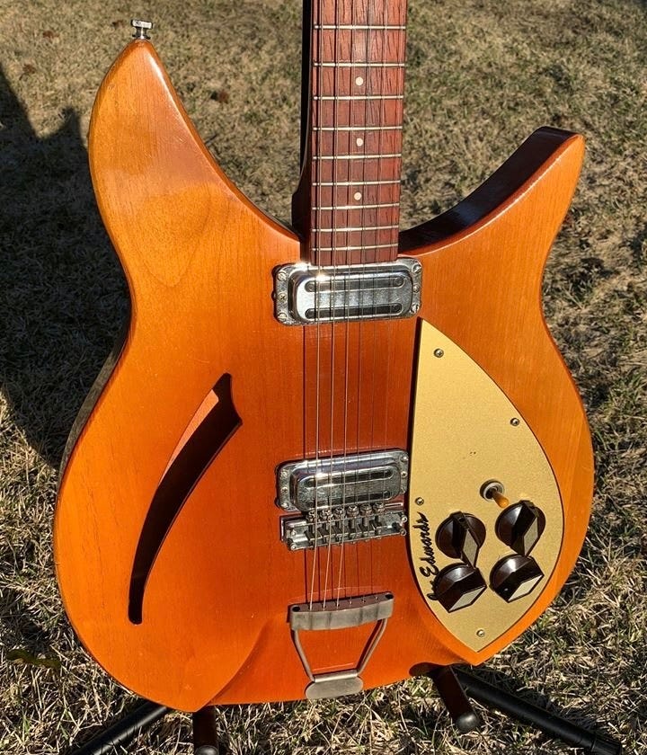 So here’s my theory—and that’s all it is, a theory, but it fits the facts pretty well. Rickenbacker was testing new finishes. They sprayed a few guitars with this unusual reverse sunburst, took a look at the results and said “er, no.” Meanwhile, F.C. Hall was putting guitars in artists’ hands for publicity—and what better to give away than one with a rejected finish? They offer Edwards a guitar, and he says “Great—would you put my name on it like Merle Haggard?” And thus, the singular Joe Edwards 365 Capri was born. Not a model, just a moment.