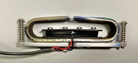 So we have an aluminum base the whole thing is attached to. This is not a functional part of the pickup, it’s just a platform. In the middle we have a very familiar looking wound coil with non-magnetic steel screw polepieces. So…where’s the magnet? The answer is all around the coil. The entire coil is surrounded by two—wait for it—horseshoe shaped magnets. The strings run between the top of the coil and the magnets. Got it? What looked like a split cover in that first pic is actually the tops of the two magnets that power the pickup. Not a cover. Part of the pickup.