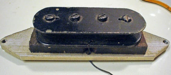 At this point, the pickup “cover” wasn’t a cover, it was an integral part of the horseshoe pickup the guitar sported. Now I strongly recommend you click that link there to learn more about the horseshoe—the world’s first electric guitar pickup—but I’ll give you a quick rundown of the really important stuff to know here. Let’s have a look at the guts of this pickup.