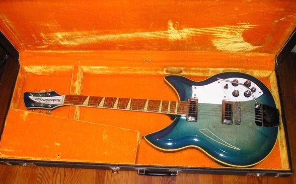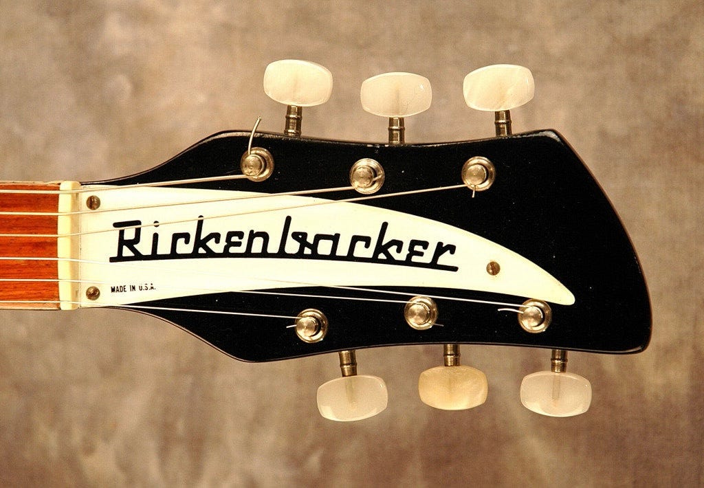 So when and why did they end up on Rickenbackers? As near as I can tell they first showed up on two different 385 acoustic models Roger Rossemiesl built in 1961. I’m struggling to find good photos, but you’re probably most familiar with the “fish tail/steer’s head” version: