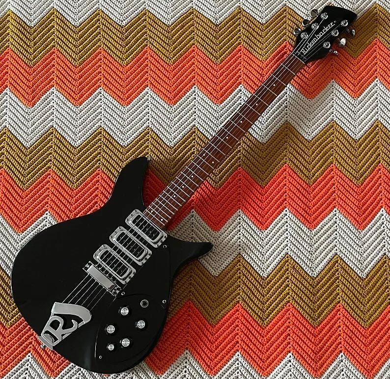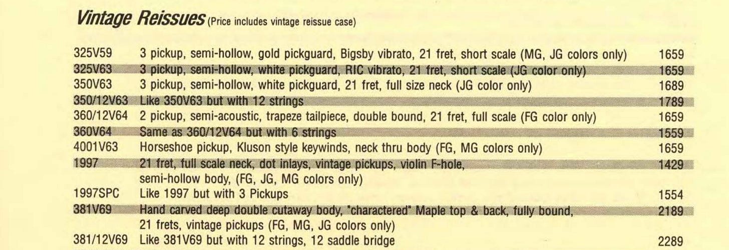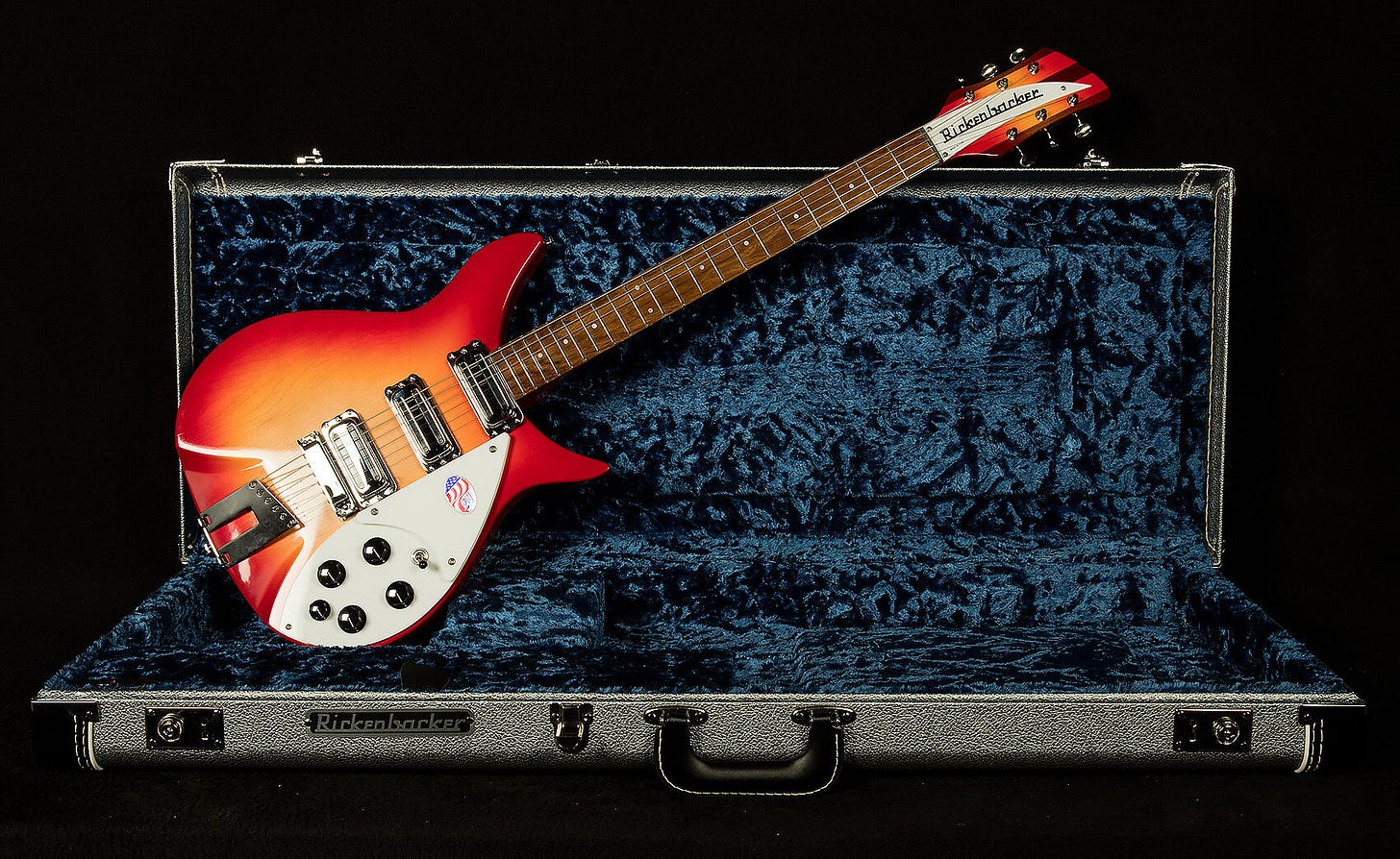 The very first 350s appeared in 1983–over forty years ago! And the basic idea just makes sense: a small bodied semi-hollowbody like the 325, but full scale. It’s actually a little surprising that it didn’t exist earlier. That said, despite solid sales over its lifetime, it doesn’t sit “top of mind” for most people when thinking about Rickenbackers. Which is odd, because there’s plenty of them out there, they’re not terribly expensive, they’re light and very comfortable to play, and they do everything you’d expect a Rickenbacker to do. I’d argue that 350s are slept on!