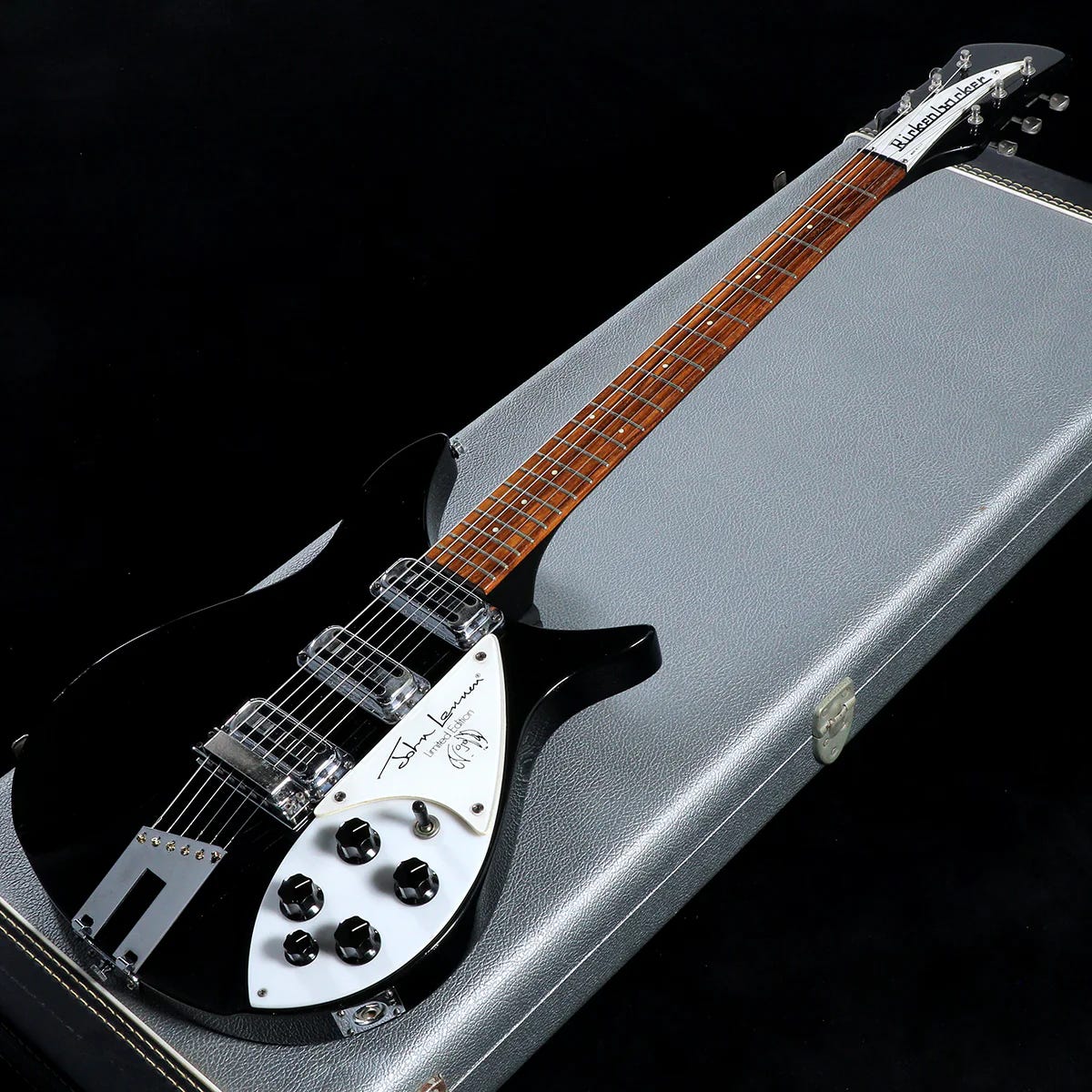Production began on the 355JL in May, and it was a dramatically different guitar from the 350 Liverpool. The 355JL featured a 21 fret neck with a square heel instead of the 350 Liverpool’s 24, three period “12k/hot” toaster pickups, a trapeze tailpiece, and a “vintage” skinny headstock with a white plexi TRC and Schaller “Ric Deluxe” vintage Kluson-style tuners.