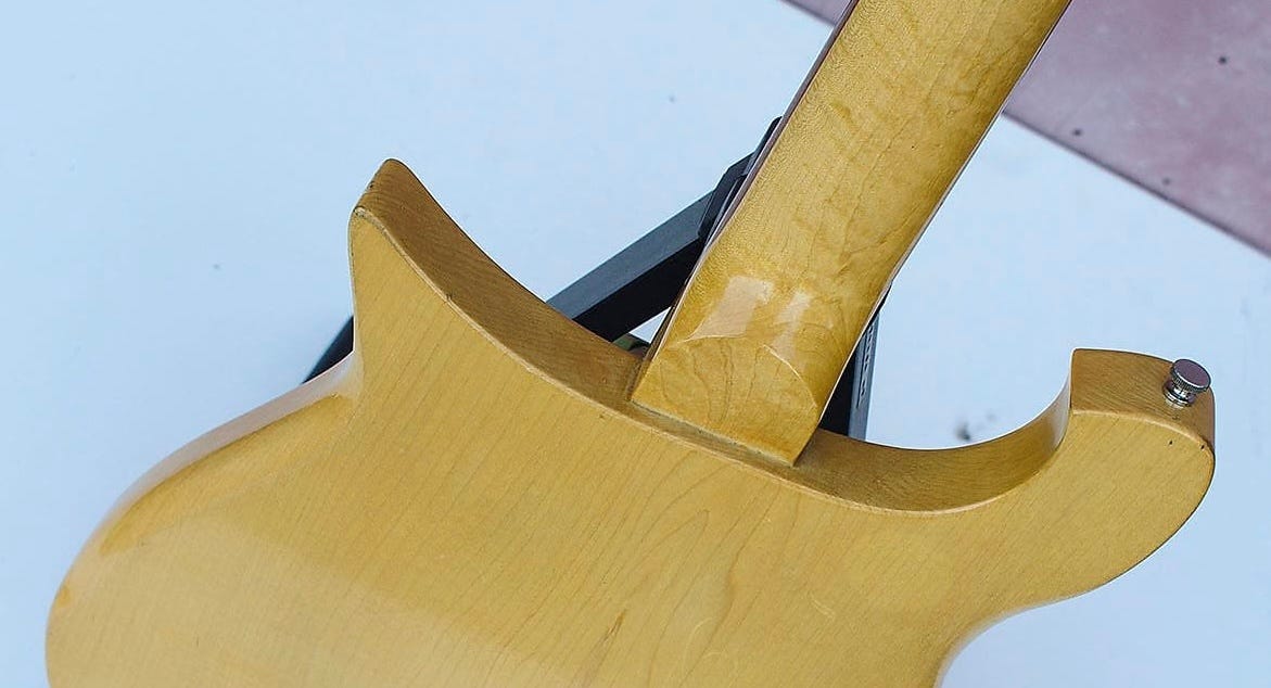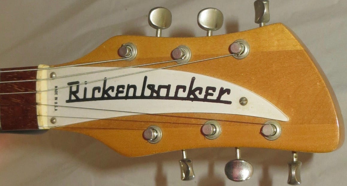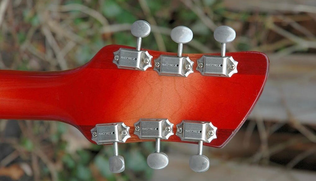 The neck featured maple headstock wings, and a “rosewood” fingerboard with dot position markers. I have “rosewood” in quotes because I don’t know the exact timeline here—early Rickenbackers used Brazilian rosewood, and at some point moved to “African rosewood” or bubinga. Where that happened on the 450’s timeline I just don’t know. Tuners were open-backed Grover “Sta-Tites”.