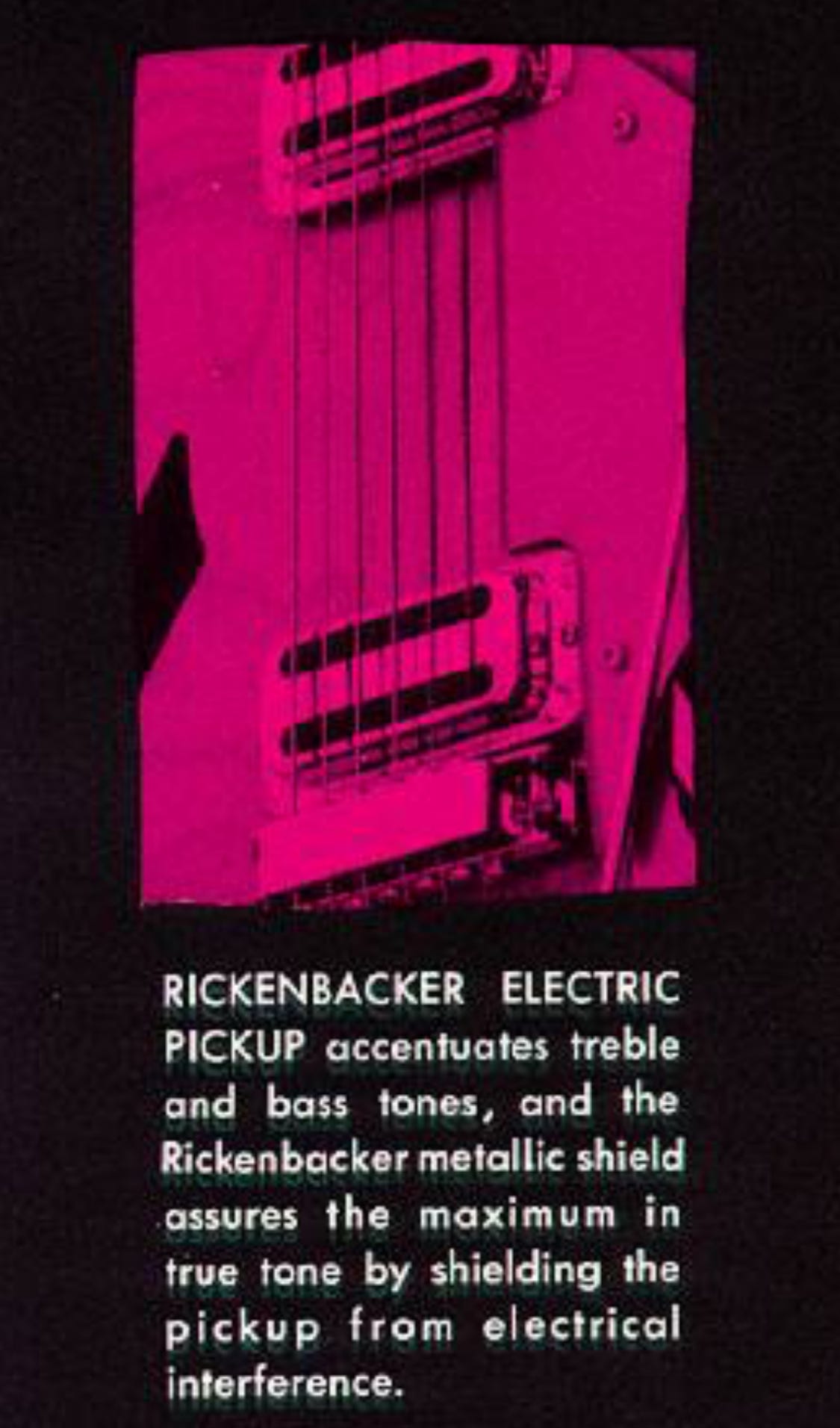 At British distributor Rose Morris’s request, “MADE IN U.S.A.” was added to the backpainted plexi truss rod cover. It would be printed parallel and below “Rickenbacker” for all models, including the 450.